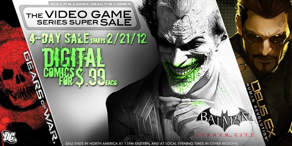 DC Digital Comics is offering a sensational sale on all titles based on some of the best-selling video game franchises of all time. Journey deeper into madhouse with special tie-in limited series that sets the stage for the critically acclaimed, award-winning sequel to BATMAN: ARKHAM ASYLUM, BATMAN: ARKHAM CITY—including exclusive digital chapters. Discover the secret history of Ghost from MODERN WARFARE 2; head to battle with Marcus Fenix and Delta Squad in GEARS OF WAR; unleash Hell with the six-issue DANTE'S INFERNO; fight against infection with BSAA Agents Gere and Sugarman in RESIDENT EVIL; and much, much more. We've got 100 video game comic issues to stock your inventory with—all for only .99 cents each! Grab them while you can before we hit the reset button and this sale disappears! The 4-Day Video Game Comics Sale begins 2/21! Play the game! Read the comics!