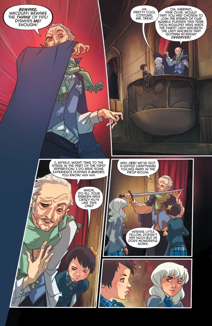 A great deal of the staff is actually drawn from Batman’s television history, most notably the 1966 Batman TV show and Batman: The Animated Series. Look for Bookworm in the library, Louie the Lilac as groundskeeper, The New Batman Adventures’ Farmer Brown as the animal sciences professor, Robin’s own Aunt Harriet as den mother of the girls’ dormitory and none other than venerated actor Simon Trent as the drama teacher. (You may know him as the Gray Ghost.)