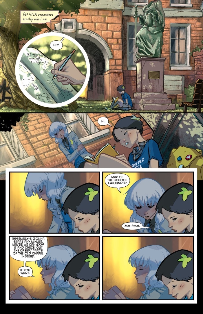 Olive’s closest friend, Mia “Maps” Mizoguchi, is inarguably the most popular character among Gotham Academy fans, with her own aspirations for becoming a crimefighter like Robin (if not a new Robin herself). She’s been featured in a number of spin-off adventures since the last time we visited the Academy. She will also not be appearing here—at least not in a major role. Maps was a first-year student during the original Gotham Academy run, so in this trip to the past, she hasn’t been enrolled yet.