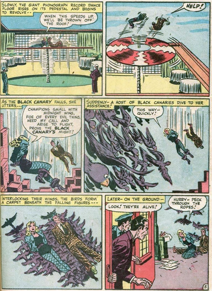 That power was introduced specifically for the younger Black Canary—though that isn’t to say the elder never had any powers of her own. Just once, in Comic Cavalcade #25, the original Black Canary demonstrated the power to, with a Green Lantern-like quatrain, beckon to her aid a…flock (or “opera,” if you prefer) of black canaries.