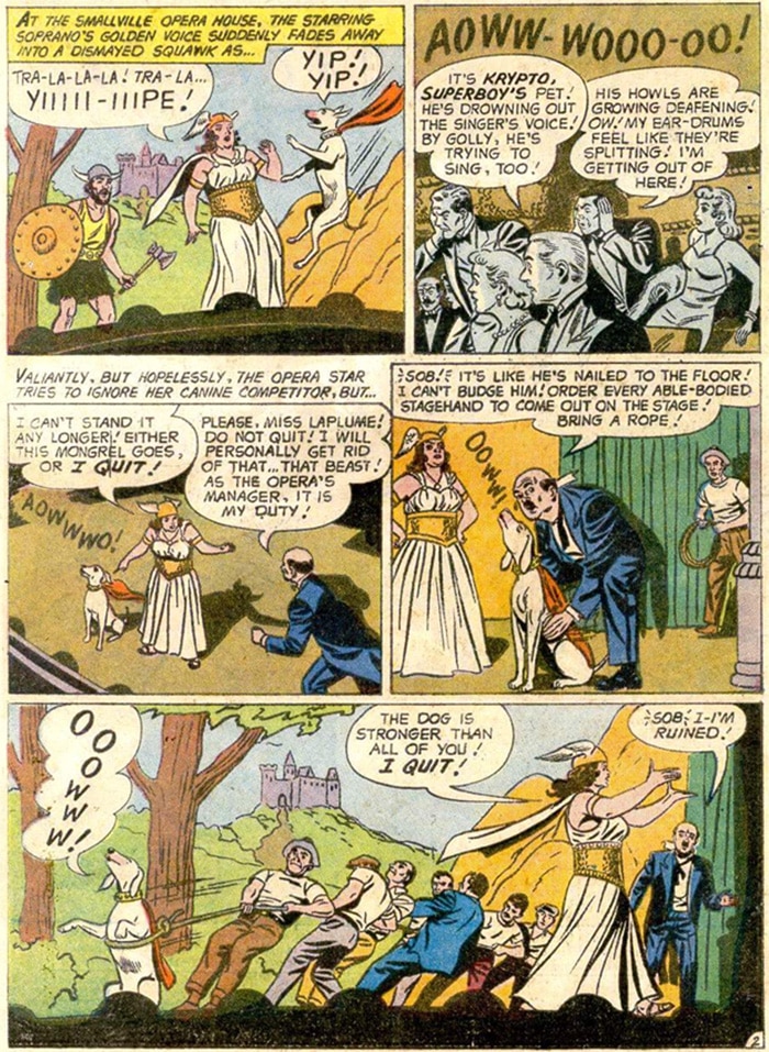 There’s really no way to know this other than to check every appearance of Krypto in sequential order, so that’s what I did. We first see Krypto barking at a supercanine volume in 1959’s Adventure Comics #266, “The Super-Pranks of Krypto.”
