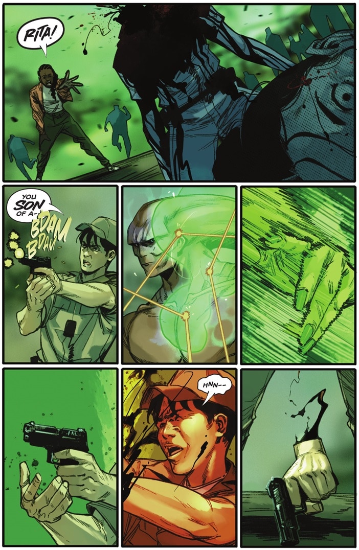 In Absolute Green Lantern #2, Sur tells the citizens of Evergreen, Nevada that he’s going to pass judgment on them and things escalate from there. Guy Gardner is incinerated, a cop named Rita is decapitated and her partner Roy gets his hand cut off. And if you’re looking for Hal to save everyone…well, he’s dealing with his own issues, namely the alien curse that just may turn him into an even bigger threat to the world than Abin Sur.