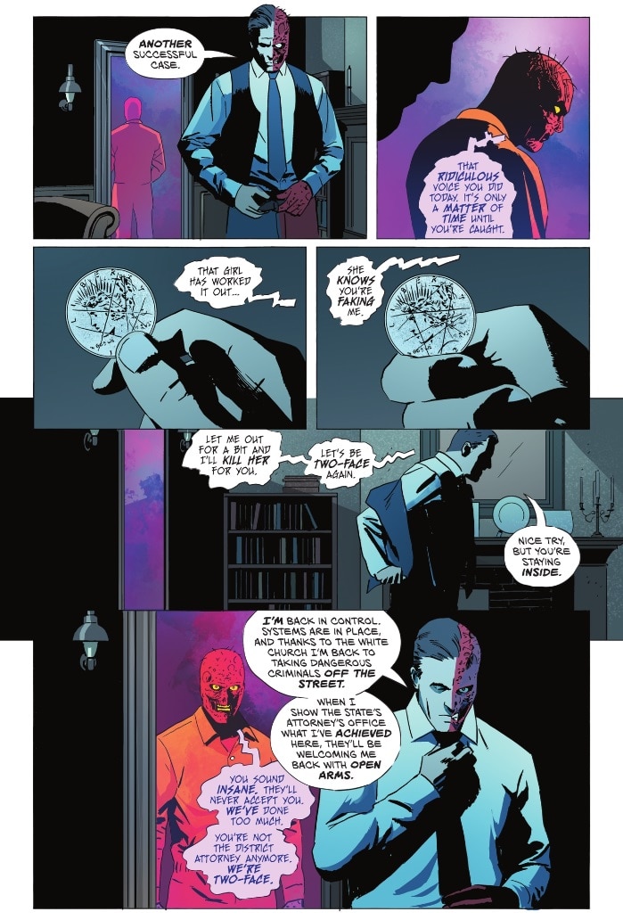 As mentioned above, Christian Ward, coming from Batman: City of Madness and Spectregraph, delivers a series that focuses on the humanity of Harvey Dent—which includes both the good and the bad. Havey’s story is tragic. He is at the mercy of his unstable mental health and is driven to do bad things that go against everything he once fought for. The series explores the question “how can a man be half good and half bad if all he does is bad?” You’re going to get to know both sides of Harvey Dent in Trial Separation.