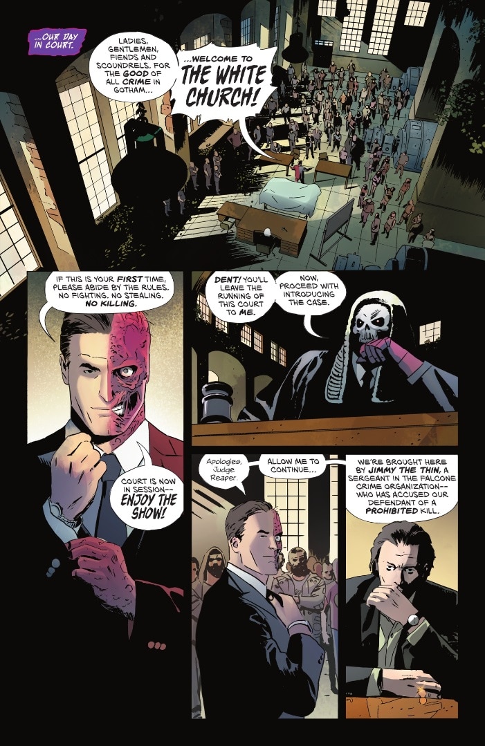 Harvey Dent, a once prominent District Attorney in Gotham City, lost everything when a brutal attack burned half his face and body and fractured his psyche. Harvey is now forced to share his mind and body with a bad-tempered and violent version of himself he refers to as “Bad-Harvey.” In a desperate attempt to get his life back on track and gain some sort of control, he returns to the courtroom to do what he does best—this time for Gotham’s criminal underworld as a defense attorney. Known as the White Church, this secretive courtroom holds trials resolving criminal vs. criminal conflict—and being found guilty could mean death. But everything changes when Two-Face is forced to go to trial against himself. You’ve never seen a courtroom drama quite like this before!