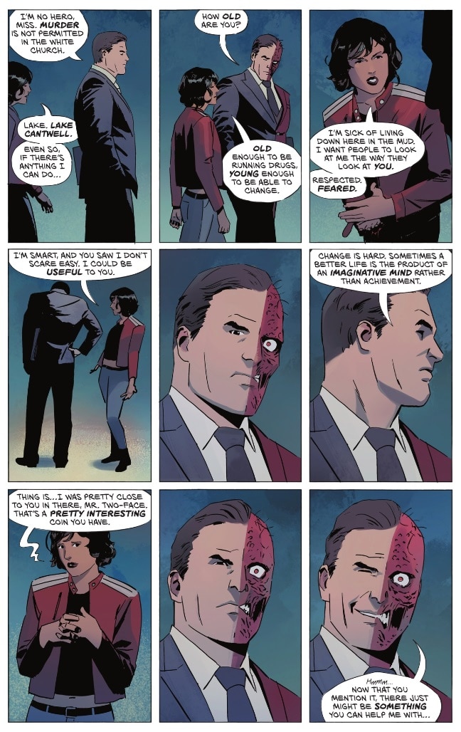 - “Good-Harvey” vs. “Bad-Harvey” is a war, and both have an army of fascinating characters. Expect to see some familiar faces like Victor Zsasz, Reaper, Killer Croc and, of course, Batman. You’ll also meet some new characters, including Die, who uses dice in a similar way to how Harvey uses his coin, and Lake Cantell, who brings so much heart to the story. Many of these characters have interpersonal relationships with Harvey that really add a lot of context and depth to his character—including some paternal relationships that help drive his story.
