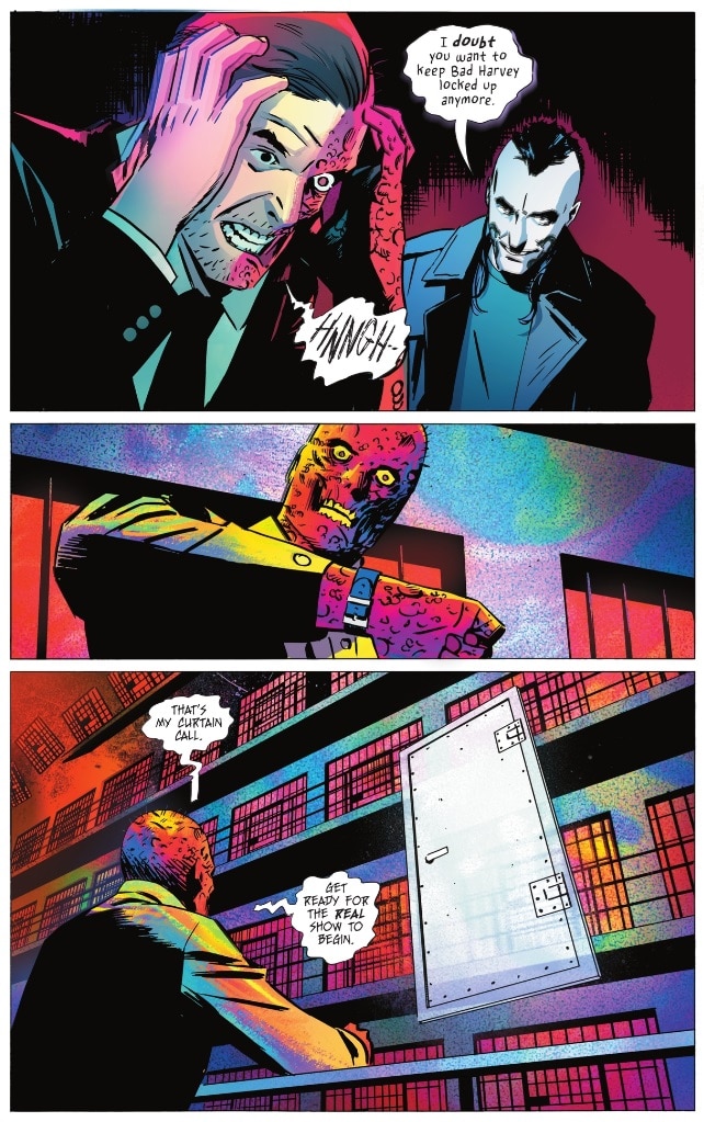 Artist Fábio Veras, having worked on comics like Harley Quinn and Nightwing, beautifully draws us into the deepest depths of Harvey Dent’s mind. The visual metaphors and brilliant spreads perfectly capture the journey that Harvey is going on—from a literal mind prison to the psychological torture of not having complete control of yourself. Many of the themes of this book, especially regarding mental health, are conveyed through Veras’s incredible artwork and Ivan Plascencia's stunning colors. Known for titles such as The Flash and Martian Manhunter, Plascencia’s work on Two-Face Trial Separation is a stunning example of how important colors are to telling a story.