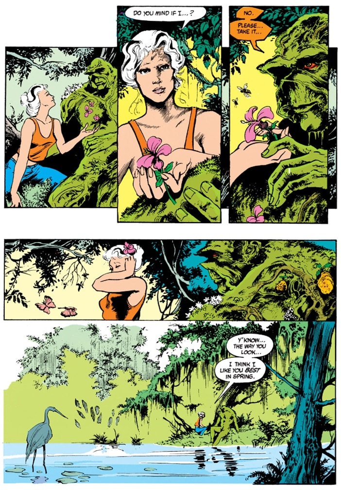 “That issue grew out of a postcard I sent to Alan,” said Bissette. “We were starting work on the issues in which Abby goes to Hell, and I sent a postcard saying, ‘You know, if Abby was a real woman, she would be in a mental asylum by now. Is there any way you can convince DC to let us do one issue where it’s just Abby and Swamp Thing having a good day in the swamp?’ Then Alan turned it into that beautiful story. We were at a point where we needed to start working in some grace notes with the characters, some downtime with the characters. Part of that emerged from my love for horror: if it’s relentless, it gets really monotonous, and you want to build an emotional orchestration of effect, where you’ve got downtime and then you crank up the heat on the stove so to speak.”