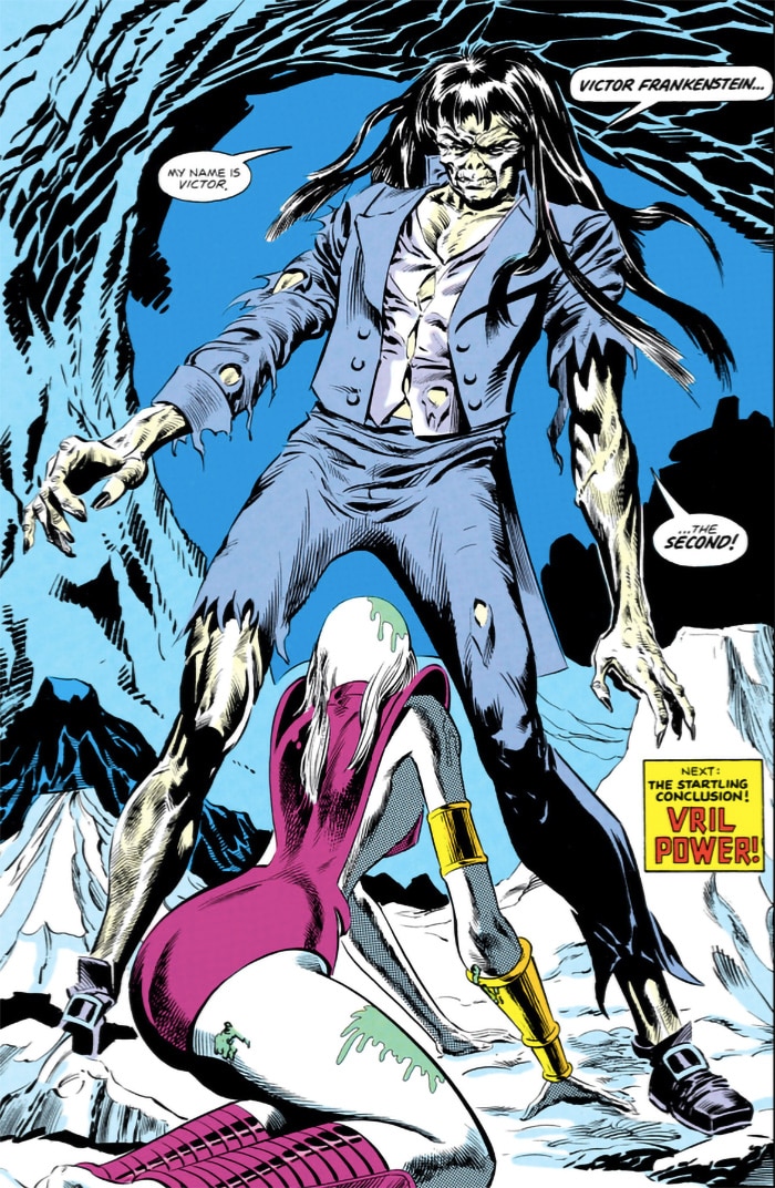 Thankfully, a different take was offered in February 1973’s The Phantom Stranger #23, in a back-up story written by Marv Wolfman and illustrated by Mike Kaluta. A continuation of Shelley’s novel, this finds the creature—now known as “The Spawn of Frankenstein”—resurrected in the present day and again misunderstood and hunted by humans. This version of the creature made a string of comic appearances throughout the ’70s and ’80s ending with The Young All-Stars #18 and #19, written by Roy and Danette Thomas and penciled by Ron Harris, in which he’s exiled in an ice cave in the Arctic and names himself Victor Frankenstein II.