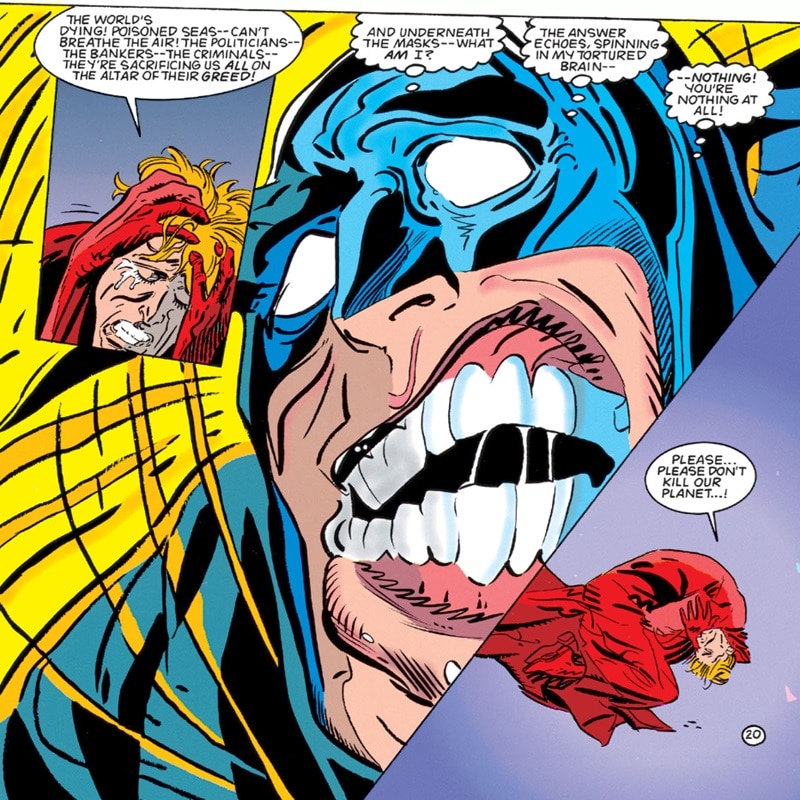 What does Lonnie Machin see when exposed to the Scarecrow’s toxin? As the voice of a youth culture disenfranchised by the misuse of the planet’s resources and imbalanced distribution of power, it’s possible that the radical Anarky has the sanest perspective of all under Scarecrow’s fear gas. In 1993’s Batman: Shadow of the Bat #18, as Batman himself suffers a crisis of self-image, Lonnie writhes under the crushing weight of the social ills selling out the future of our world for the short-term gains of an oligarchic few. Boy, it’s a good thing we sorted all that out in the past 30 years, right?
