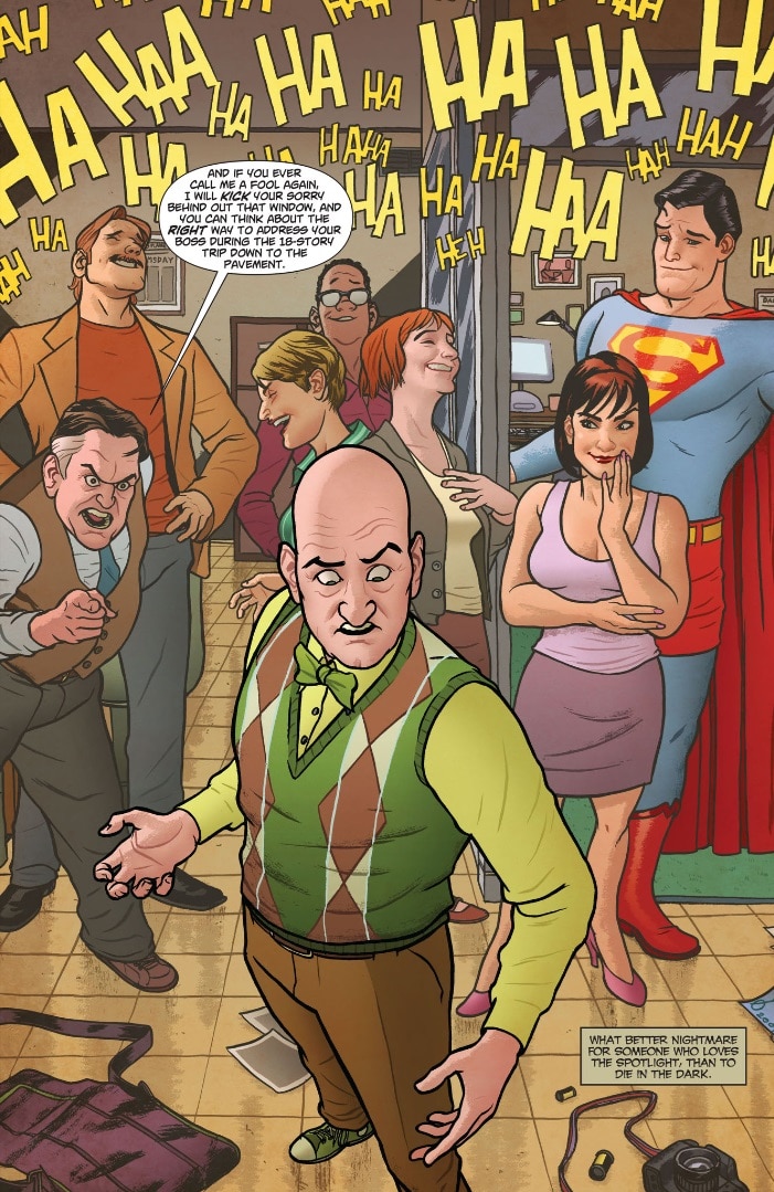 As new acquaintances of Luthor through this year’s Superman movie were quick to learn, Superman’s greatest nemesis is a creature of ego. As one of the richest, most powerful men in the world, it’s always that pernicious “one of” qualifier that gets under his hairless skin. Not even Superman—especially not Superman—is exempt from his consuming jealousy. So, when Lex Luthor breathes in the Scarecrow gas in 2009’s Superman/Batman #65, what does he see? Himself brought low in the role of Metropolis’ most humble resident, the most insignificant specimen Luthor can bring himself to conjure the name of: Daily Planet photographer Jimmy Olsen. A game of opposites that the likes of Matt Fraction and Steve Lieber would continue to explore in their own Superman’s Pal, Jimmy Olsen.