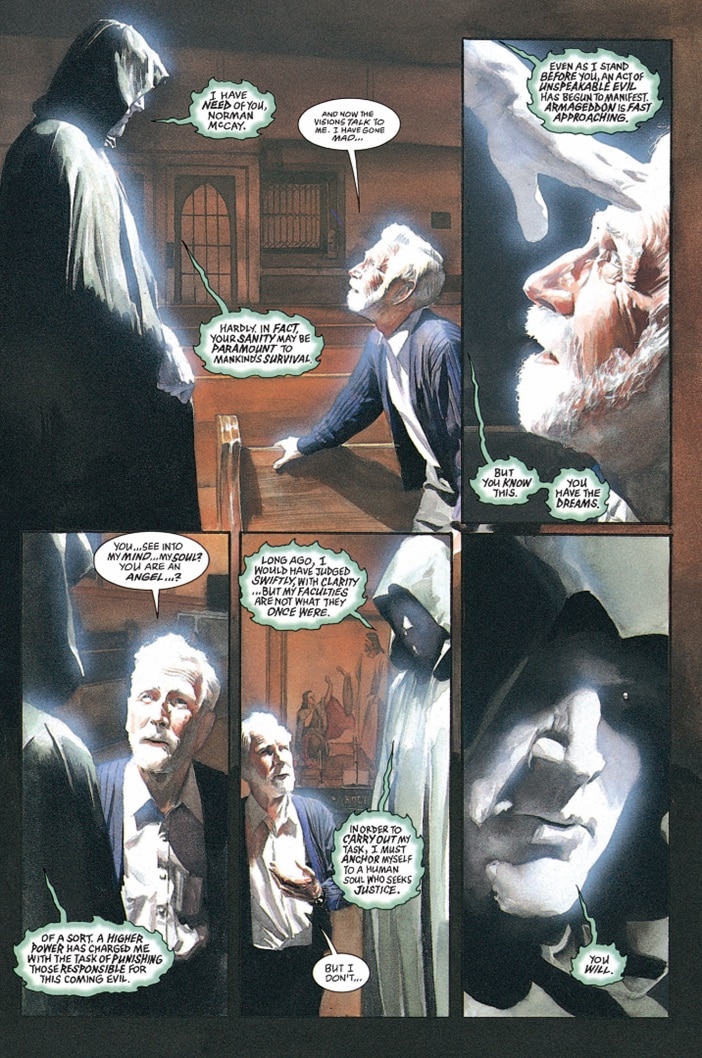 Ross first pitched the project to DC in the wake of his breakthrough success with the 1994 limited series Marvels (written by Kurt Busiek for the distinguished competition). Like Marvels, Kingdom Come would be a character-packed epic seen through the eyes of a non-powered everyman, in this case elderly Pastor Norman McCay. The son of a Protestant minister, Ross held DC’s heroes in near religious light, and his father would inspire McCay, guided on his journey by the godlike Spectre. The book’s title was taken from the Christian “Lord’s Prayer”: “Our Father, who art in heaven, hallowed by thy name. Thy kingdom come, thy will be done, on Earth as it is in heaven…”