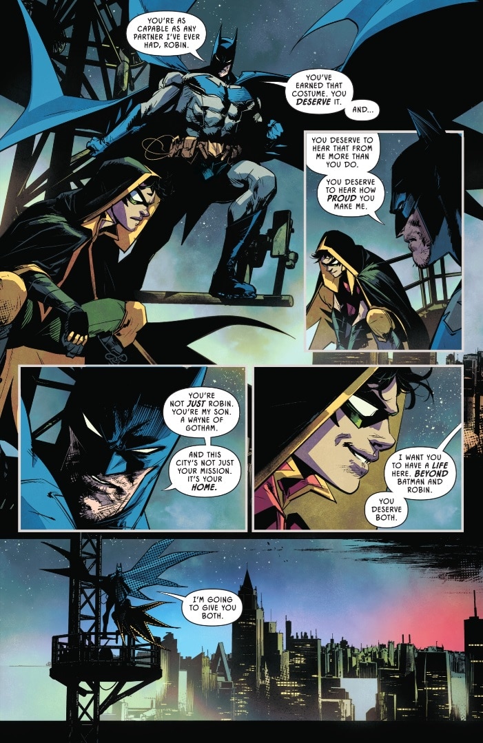 “I want you to have a life here,” Bruce tells Damian in Batman and Robin #25. “Beyond Batman and Robin. You deserve both. I’m going to give you both.”