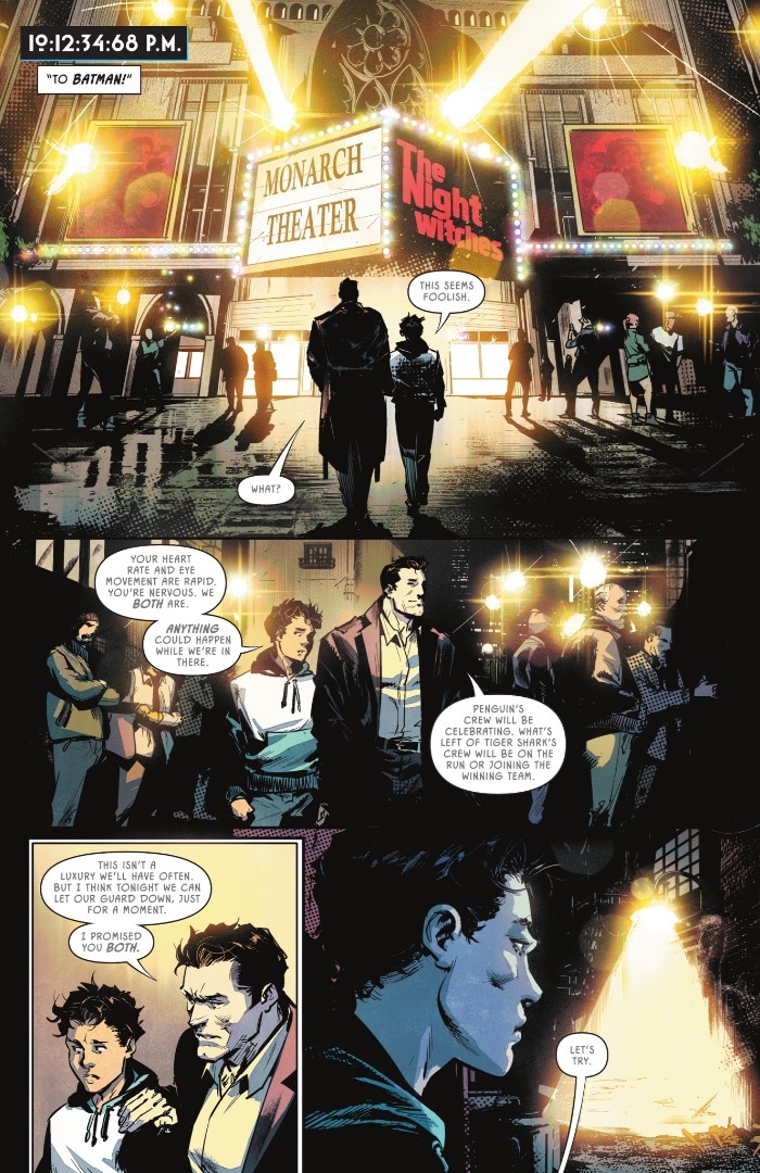 However, it’s clear Bruce is trying to convince himself as much as he’s trying to convince Damian. Naturally, this is when the Quiet Man chooses to launch an assault on Penguin’s operations, which will probably make Bruce hesitant about taking another night off.