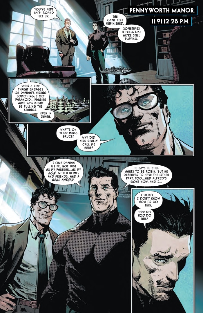 Struggling with how to be the father Damian needs, Bruce turns to Clark Kent in this month’s Batman and Robin #27. In a moment of emotional vulnerability, Bruce admits that he isn’t sure what he’s doing as a parent, and everything was easier when Alfred was around.