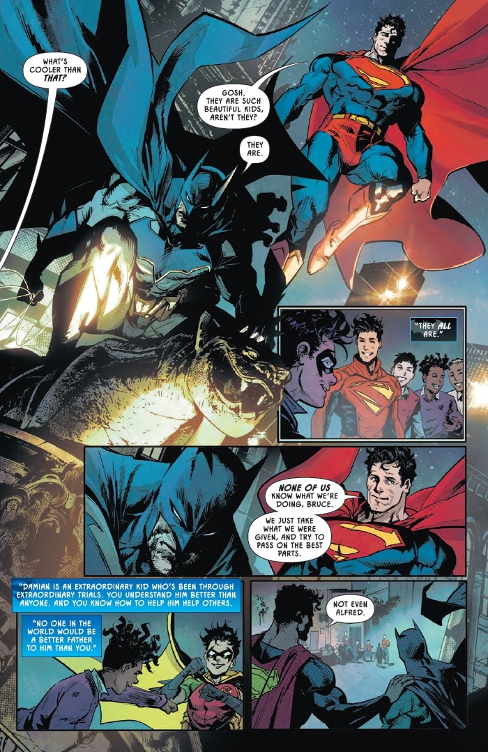 “None of us know what we’re doing, Bruce,” Superman says. “We just take what we were given and try to pass on the best parts. Damian is an extraordinary kid who’s been through extraordinary trials. You understand him better than anyone, and you know how to help him help others. No one in the world would be a better father to him than you. Not even Alfred,”