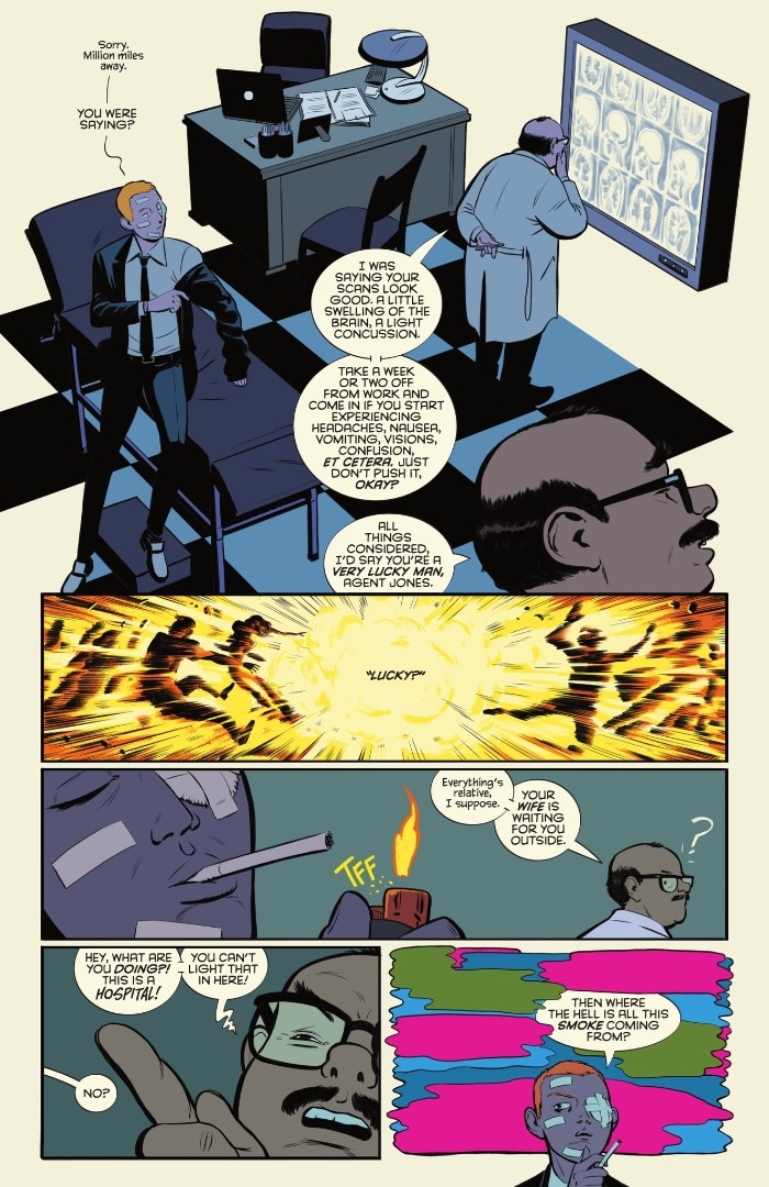 We would also be remiss not to acknowledge Hassan Otsmane-Elhaou, who here may challenge your assumptions on just how much a letterer can contribute to a story. His fine, detailed lettering work, warping and bending with the story and psyche, shapes the mental dialogue of John Jones’ boiling, fevered world. The lettering here is responsible for a great deal of what makes this book feel so unique, even within such a unique line of comics.