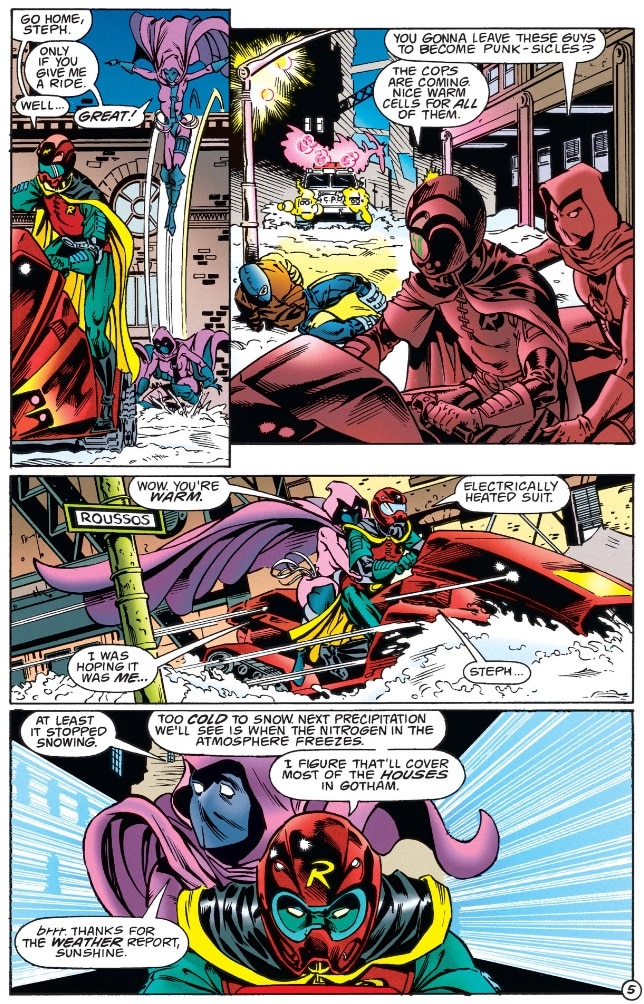 In one memorable chapter, we see Robin (Tim Drake) arrive on the scene to help Spoiler, rolling up in an R-styled snowmobile and decked out in a new costume that includes an electrically heated bodysuit. Long black sleeves run down his arms, in stark opposition to the bare arms Robin’s costume was known for up until then. It’s a design choice that would be echoed years later when Damian Wayne took up the mantle.