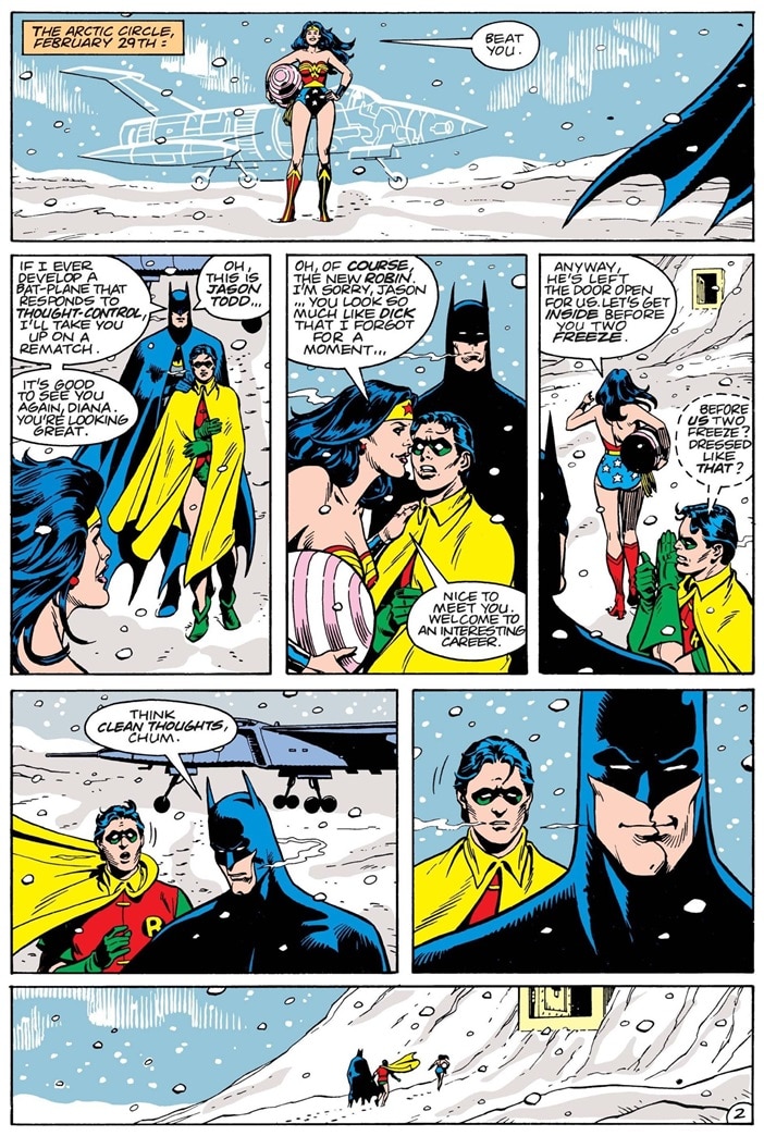 This wouldn’t be the first time we would see the Bat-Family thicken their hides with heated costumes for the winter. Years earlier in Batman Annual #13, we see Jason Todd wearing a version of Robin’s suit that incorporates a baggy sweater, as he hurls snowballs towards a suspect. In Nightwing #54, Blüdhaven’s hero leaps into frozen waters to save a child, protected by his heated suit, but still catching a cold from exposure. Finally, in the recent “One Bad Day” one-shot featuring Mr. Freeze, we see Batman and Robin in layered costumes, with Robin (a young Dick Grayson) sporting long black sleeves and a hoodie for comfort.