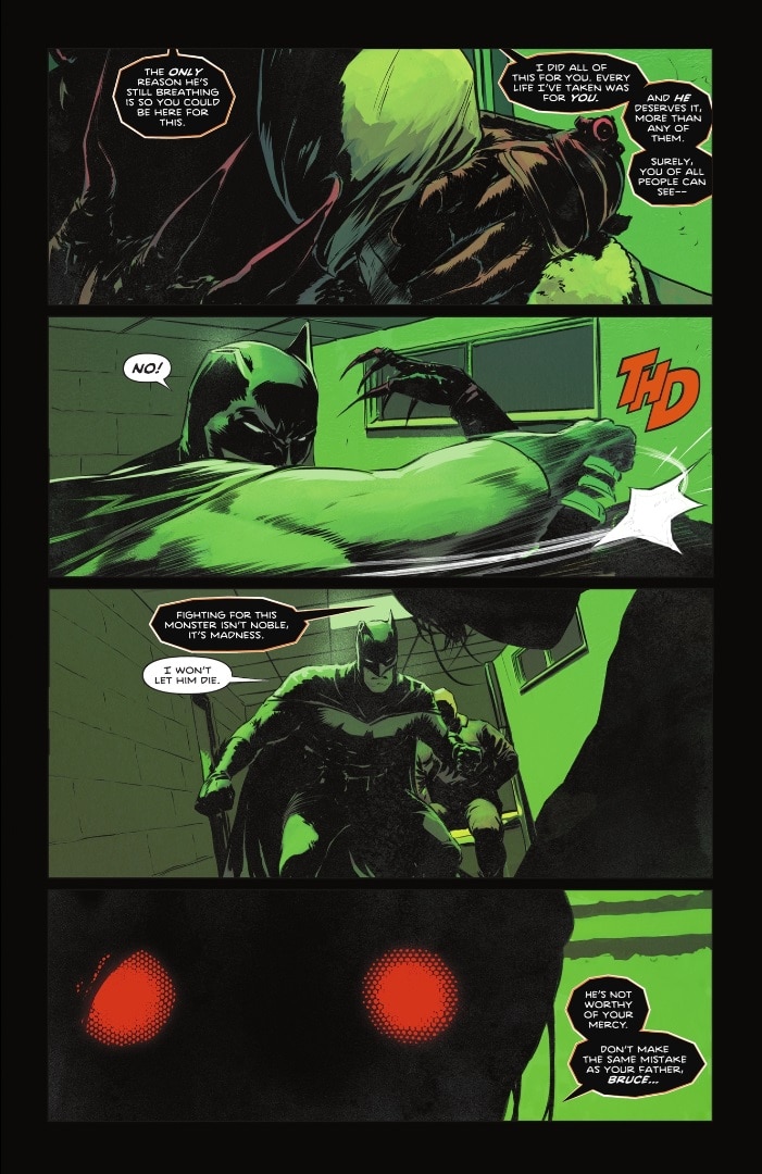 Now, you may be thinking, “Well, sure, isn’t Batman always?” Ideally, yes. And yet, over the years, many stories have been written on how powerful and violent Batman and his adversaries can be towards each other as a way of increasing the book’s intensity. The darker the supervillains, the darker Batman gets to be. With Tom Taylor, Batman’s always thinking about solutions and how fast he must operate to stop Asema’s killings, protect potential victims and keep the violence from spilling out further into Gotham City. No-win scenarios are quickly defeated with Batman’s experience and determination, fueled by a dogged commitment to saving lives. Taylor’s Detective Comics becomes a series where the art of detection is a means of Gotham’s—and Batman’s—spiritual salvation.