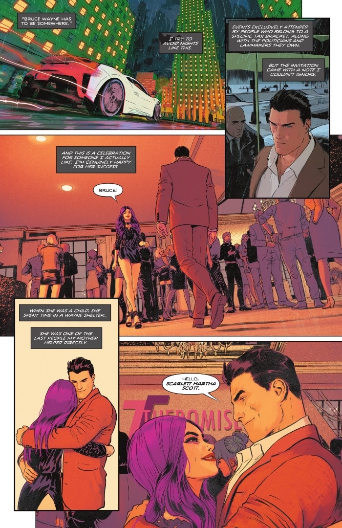 - The Bruce Wayne persona is used really well here, incorporating both his standing as a public figure and celebrity, as well as a famous victim of crime and a lady’s man. On occasion, Batman stories might forego the Bruce Wayne identity to jump straight to the action, but here we see an ideal balance of the hero’s complete nature.