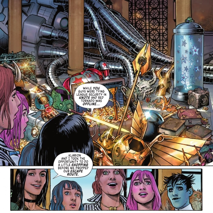 Cheetah and Cheshire Rob the Justice League #6 features some weird items that look tantalizingly familiar. What are the goggles? What is the weird looking gauntlet? What is the horned skull?