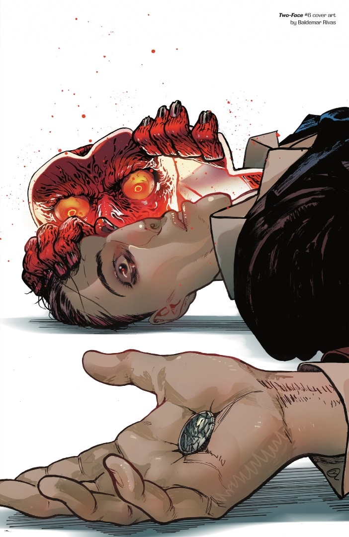 However, I will say that it's not necessarily the case that Harvey Dent developed his alternate personality during the acid-splashing incident. Many versions of Two-Face's origin story, including the ones we see in Batman: The Animated Series, Scott Snyder’s All-Star Batman and the one retold in last year's Two-Face series, have presented us with a young Harvey who has always had another personality inside of him—one which he mainly kept hidden from the world, until the trauma of his acid attack presented him with a catalyst to express it more openly.