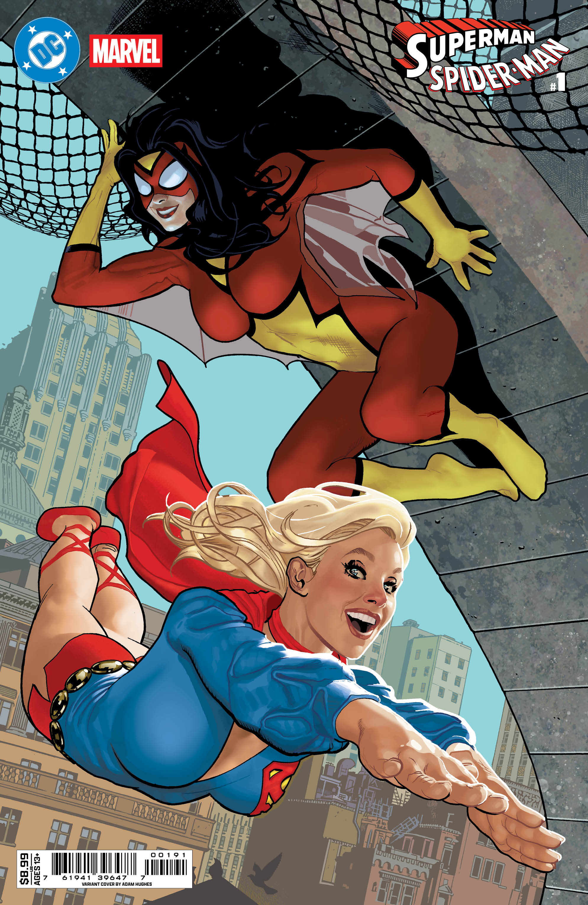 Superman/Spider-Man #1 variant by Adam Hughes, featuring ‘70s Supergirl and ‘70s Jessica Drew as Spider-Woman