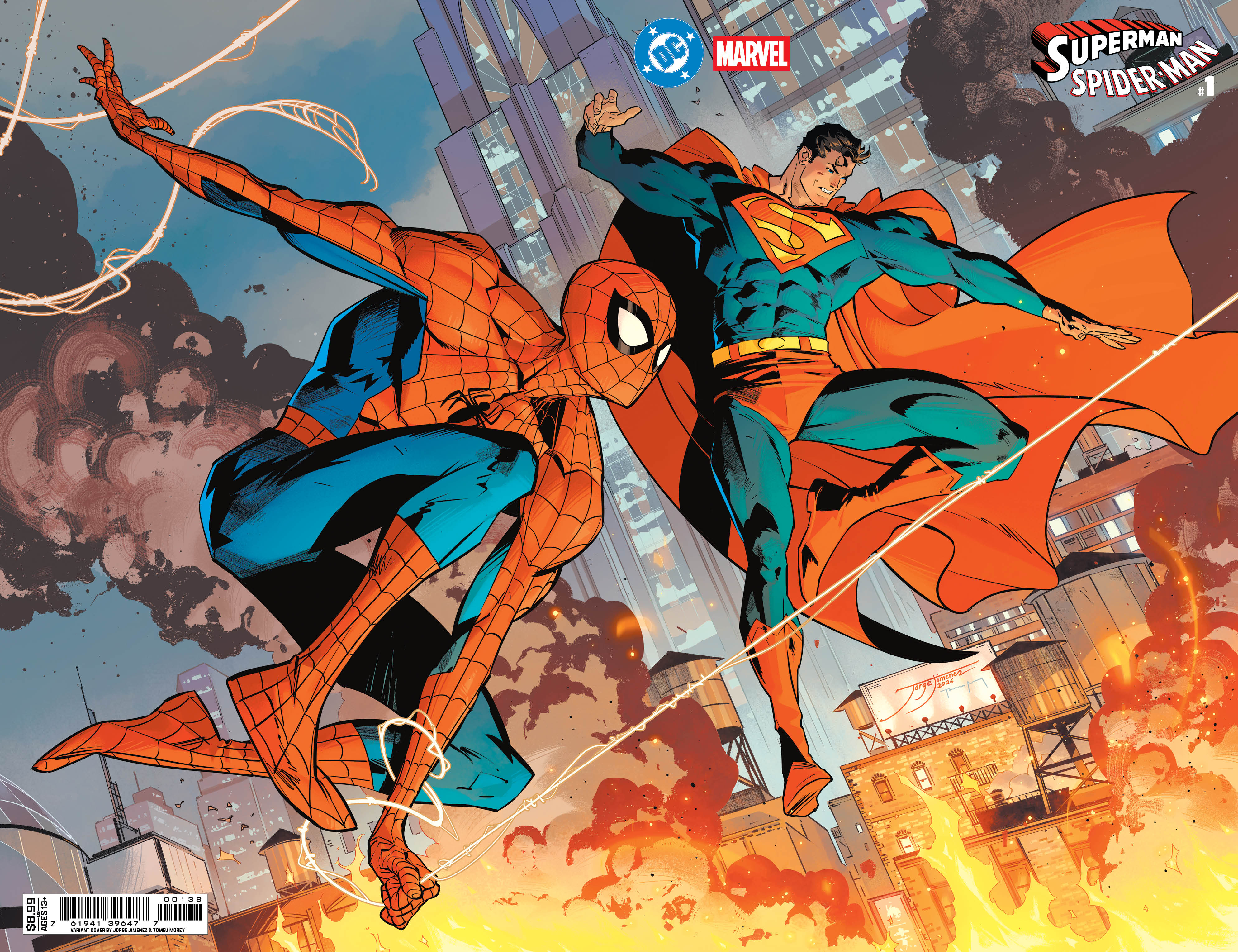 Superman/Spider-Man #1 wraparound variant by Jorge Jiménez and Tomeu Morey, featuring Superman and Spider-Man