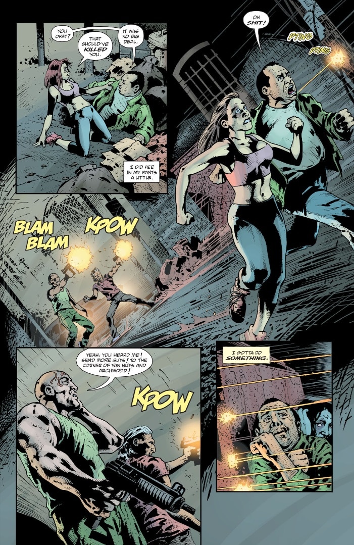 Kripke’s world here is presented with clear-eyed frankness by artist John Higgins. A veteran of hard-hitting comics such as 2000 AD and Before Watchmen, Higgins might be best known for his psychedelic colors on Batman: The Killing Joke. In this story, his realistic style powers the real-world nature of the series, and there’s a lot of beauty in its ugliness. Josh is a normal, if somewhat unsightly person, with his wife and children looking as typical and unassuming as can be. This only serves to make the action sequences feel extra-over the top, which is both amusing and entertaining as Higgins brings this humdrum normality into classic super-powered excitement.