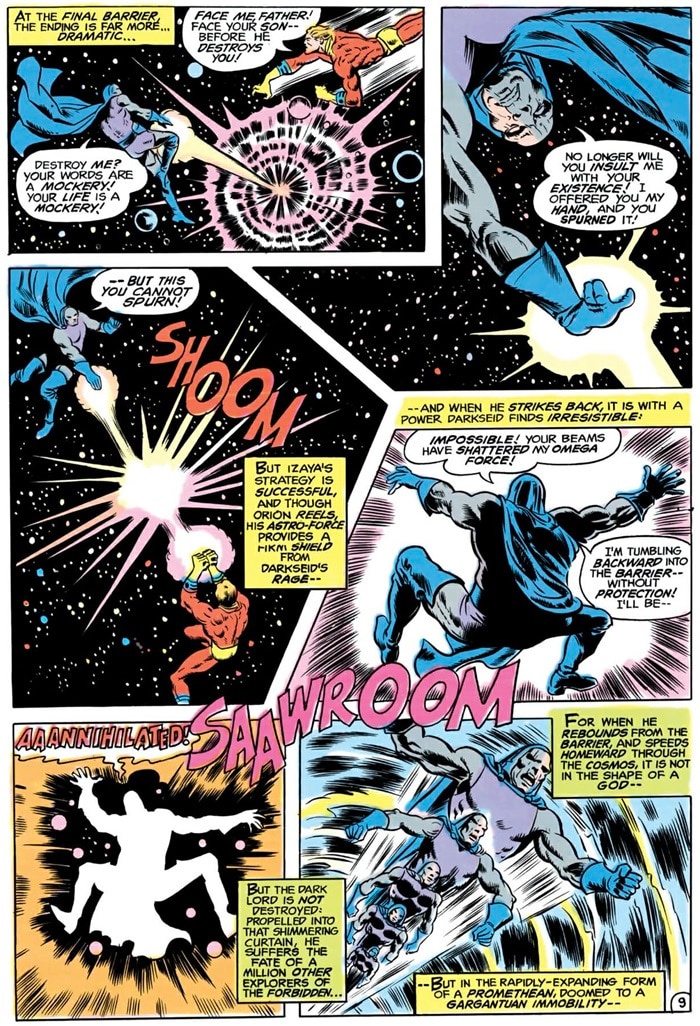 After years of almost-battles and effortlessly repelling wannabe-attackers, Darkseid’s first real fight was with his son Orion in Adventure Comics #460. The battle only lasts a page, but what a page it is. Orion uses his Astro-Force to shield himself from Darkseid’s Omega Beams. Orion then blasts his father into the Great Barrier, which causes him to lose control of his body and turn into a Promethean Giant. DeSaad mistakes Darkseid for a hostile force and uses an Apokolips cannon to destroy him (until he got better for another story).