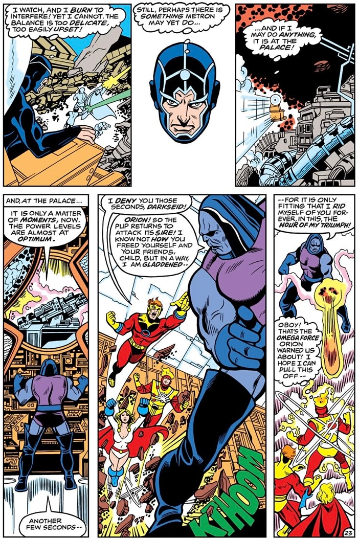 Power Girl, Firestorm and Orion directly take Darkseid on, with Firestorm doing most of the heavy lifting. The Nuclear Man uses his atomic restructuring powers to turn Darkseid’s Omega Beams back at him. Darkseid was eventually finished off by one of his own weapons, which Metron had secretly sabotaged.