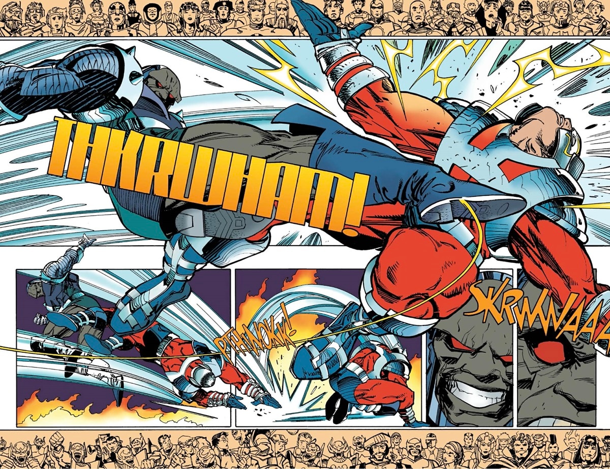 This is a battle where Darkseid upped his game, brainwashing an entire planet of Daxamites into doing his bidding. To stop Darkseid, the Legion of Super-Heroes have to throw everything they can at the villain. We’re talking almost every Legionnaire who ever existed, a clone of Orion and various other allies. This storyline also features Superman’s (during his Superboy era) first fight with Darkseid and gives us an epic Keith Giffen penciled panel of Superboy and Supergirl punching Darkseid out.