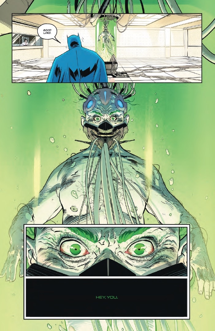 This is where Jorge Jiménez gets to have some fun. The breathing mask on Joker’s face still resembles a wicked smile and the villain’s wide eyes are unsettling. It’s just the Joker in a stasis tube, seemingly harmless, but Jorge Jiménez makes it one of the most chilling images you can imagine.