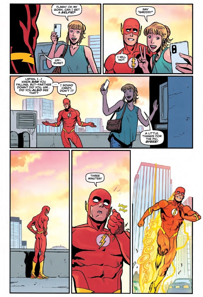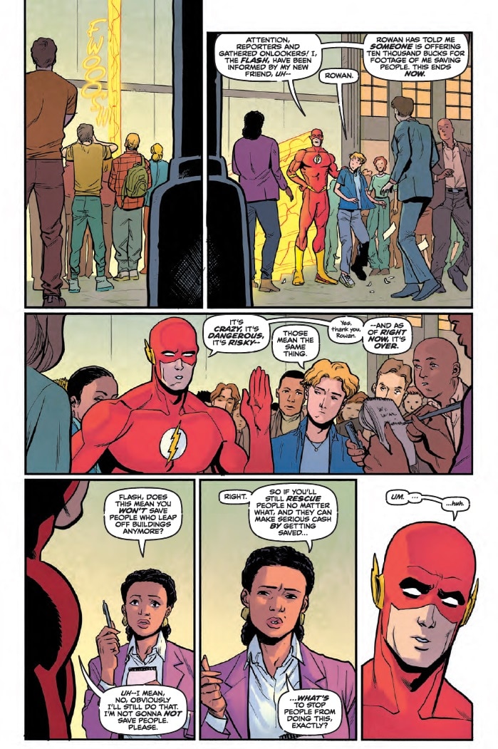 I think there’s a lot of different ways you can do that. The one we have in the first issue is there’s this social media trend of jumping off a building with a camera and recording yourself being rescued by the Flash. Because of course he’s going to do it. That’s not a thing he can solve by running faster. People are just going to do it more.