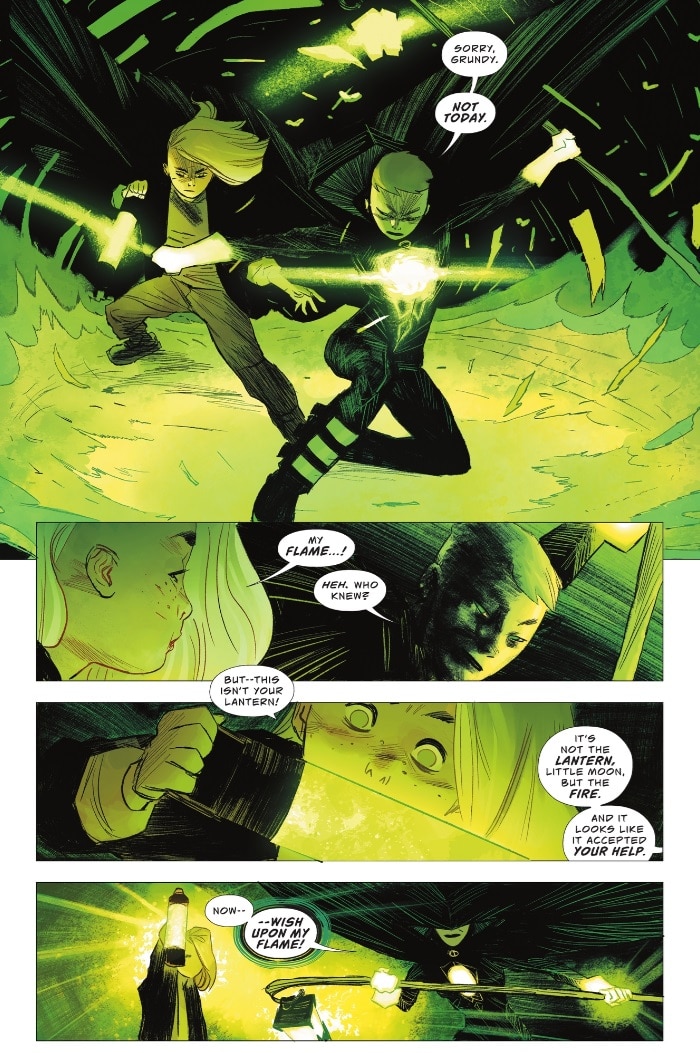 - An unlikely hero steps up: I love it when stories follow an unlikely hero called to action. Rina is a Green Lantern who struggles with willpower and her mental health. She became a Green Lantern due to circumstances beyond her control and inherited a broken world and the responsibility, and power, to be a hero. When we meet her at the beginning of this story, she’s finding her purpose at the bottom of a bottle and masking her vulnerability behind a stoic, uninterested exterior. Her character growth coincides with her relationship with the young Lunette, whose bravery and optimism teaches Rina what it means to be a hero.