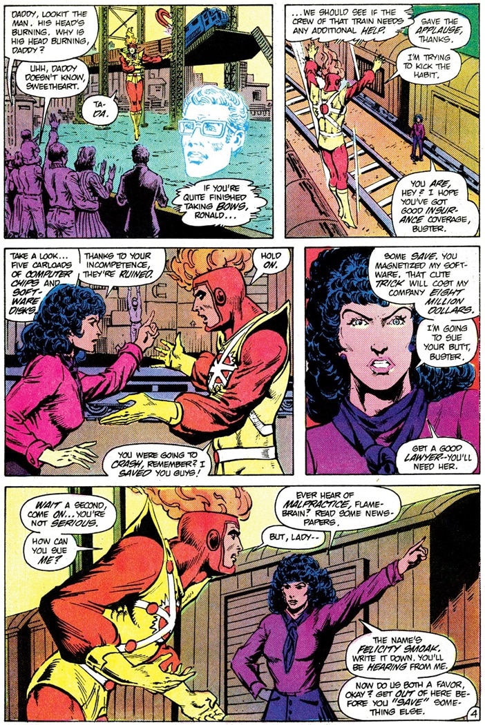 Before Felicity Smoak was Oliver Queen’s TV wife, she was Firestorm’s stepmother. However, to say that Felicity and her future stepson got off on the wrong foot is an understatement. When Firestorm first met Felicity in 1984’s The Fury of Firestorm #23, she was running a computer software company and Firestorm had accidentally ruined a shipment of her equipment when he stopped a train crash. Felicity filed a lawsuit against the young hero and things only got more complicated from there.