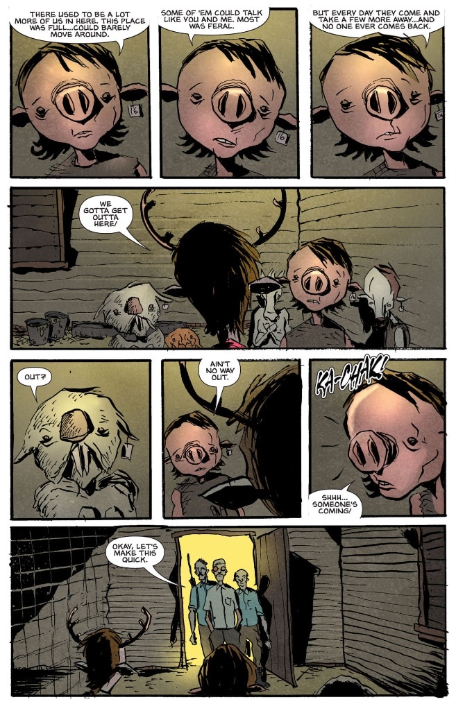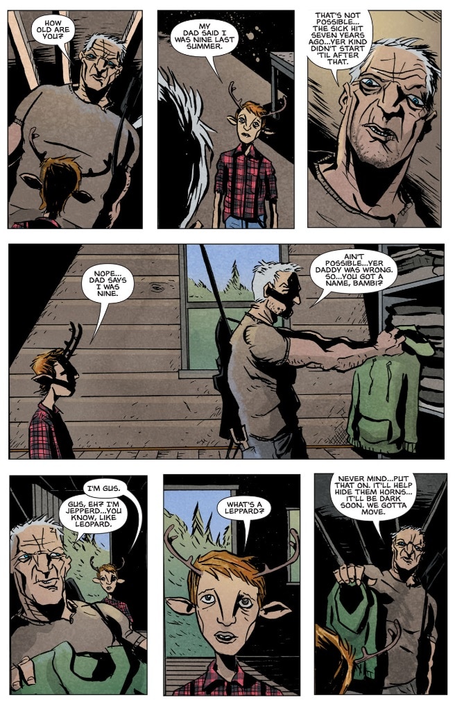Each issue, or chapter, presents a new question regarding how and why this world operates as it does. The illness started seven or eight years ago and since then, children have been born as animal-hybrids. They are immune to the disease. Why? How do they relate to it? Learning that Gus is nine years old, making him older than this virus, has piqued my interest most of all. Is he the first hybrid? Did he somehow cause this?