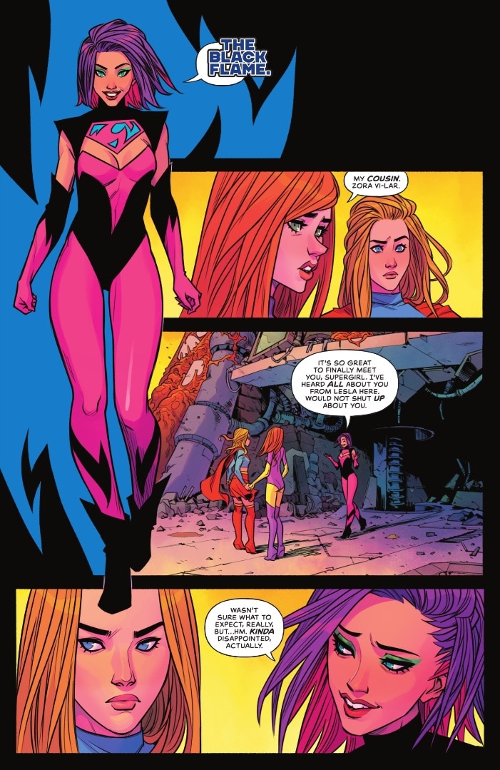 Tapped by her famous cousin to keep an eye on Kandor, Supergirl immediately intervenes when she discovers the city is in trouble—especially when evidence suggests that her former ward and estranged friend Lesla-Lar may be behind it. That proves to only be partially true, however. The real culprit is Lesla’s cousin, Zora Vi-Lar, the Black Flame, who has seemingly manipulated Lesla into helping her stage a coup against the ruling science council.