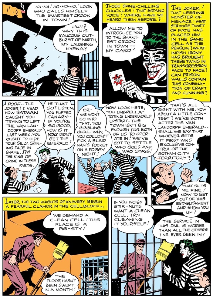 In 1944’s Batman #25, Joker partnered with the Penguin, marking his first official supervillain team-up. (The Joker encountered Catwoman in 1940’s Batman #2, but they had been adversaries.) Some prison administrator thought it would be a bright idea to put Penguin in Joker’s cell, which results in the two villains helping one another escape and forming a criminal alliance.
