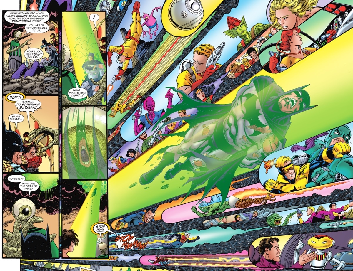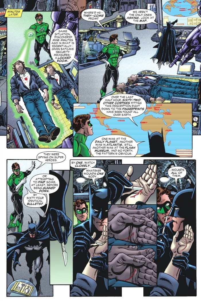 Our saga begins, as many dramas often do, with a murder. An unremarkable man with a gunshot wound to the chest is found floating in Earth’s orbit by Green Lantern. The strangest part? The same dead body has been found in 62 other locations across the Earth. Batman and Hal Jordan’s pursuit of the truth behind this mystery will literally open an investigation on the impossible, taking the heroes and their unexpected allies to the edges of the cosmos and beyond the bounds of time. Before too long, Supergirl and Lobo, Blue Beetle and the Legion of Super-Heroes, and even the Challengers of the Unknown all find themselves involved in a scheme to manipulate the fundamental forces of the universe for fun and profit.
