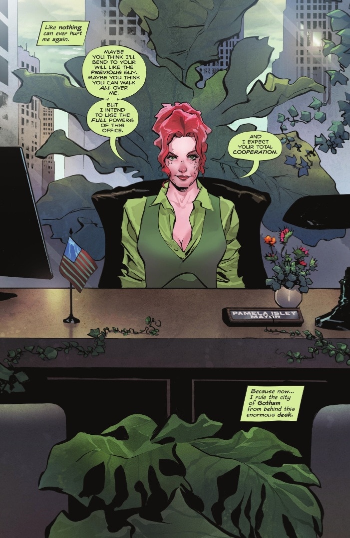 There’s also the fact that Ivy ran on an appealing platform. According to Poison Ivy #42, she ran on improving roads and bridges, increasing affordable housing, improving health outcomes and making Gotham carbon neutral in two years. That’s the kind of platform that can make voters forget you’re a killer. However, in Ivy’s case, being a killer actually wasn’t a liability.
