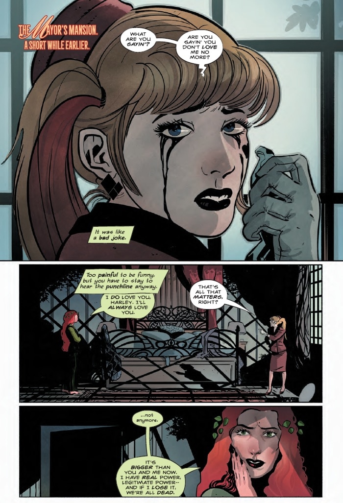 And…it’s Harley! Harleen has always had a special place in Ivy’s heart. She’s one of the few humans Ivy genuinely likes. (Some might even argue that Ivy loves Harley more than nature itself, though that is up for debate.) The point is, Ivy pushing Harley away for political purposes is a surprising move that speaks to how the office has changed Pamela.