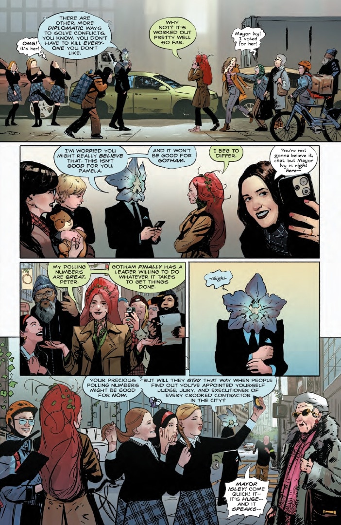 We’re still early in Ivy’s tenure as mayor, but I’m curious to see how this will affect the other Gotham titles. We’re already starting to get a sense. Over in Batman #8, we see Mayor Ivy sign off on Commissioner Savage’s war on the Bat-Family, which will definitely have some repercussions for the Dark Knight and his allies. Meanwhile, in Harley Quinn #60, we see some smalltime crooks talk about how great things have been since Ivy took over, and we get some hints about the toll this has taken on Harley’s psyche.
